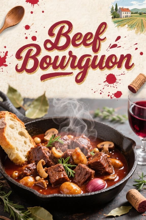 I’m convinced you’ll appreciate how the beef becomes melt-in-your-mouth tender after simmering in red wine for hours, creating that signature depth that’s impossible to achieve with rushed cooking methods.