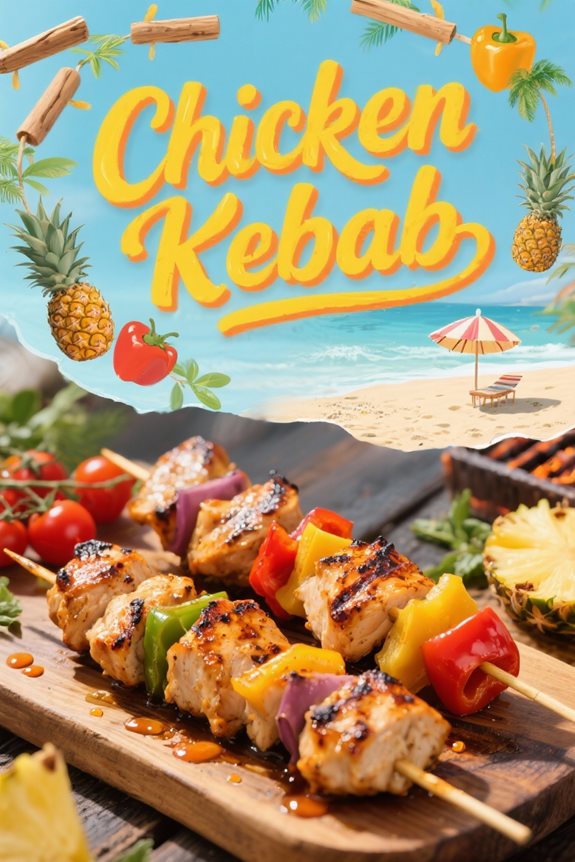 Grill or broil the kebabs until the chicken is cooked through, which typically takes about 3-5 minutes per side depending on your chicken chunk size. You’ll want to turn the skewers once or twice to guarantee even cooking and those gorgeous grill marks. For a healthier cooking alternative, try using a large premium air fryer to achieve that perfect crispy exterior while using less oil.