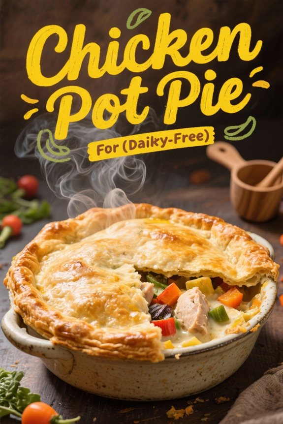 I love sharing this Dairy-Free Chicken Pot Pie recipe because it’s truly a game-changer for anyone who misses this classic comfort food due to dietary restrictions. I’ve perfected this version after years of experimenting with non-dairy alternatives that don’t sacrifice the creamy richness we all crave. The combination of golden puff pastry and savory filling creates that nostalgic experience, while clever substitutions guarantee everyone at your table can enjoy it. Let me show you how simple it is to create this cozy meal that will become your new go-to dinner.